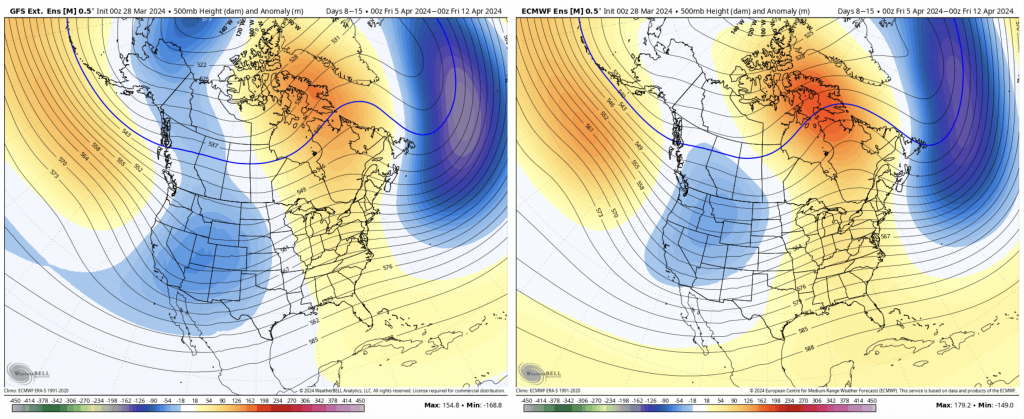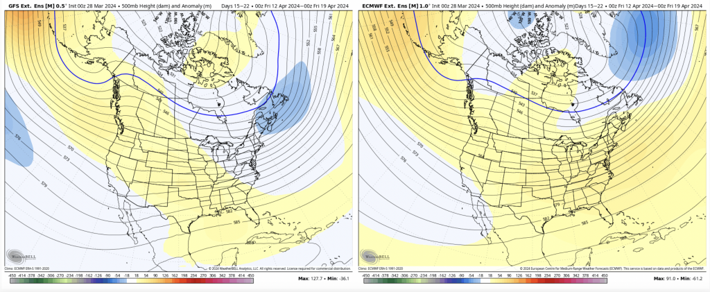For Days 14-21 it doesn’t look overly exciting, but you see the GFS picking up on an eastern trough with a negative anomaly in the Canadian Maritimes, and the Euro has it just farther to the north. This certainly sets us up for an interesting pattern for Patriot’s Day week/April break, which currently looks like it may linger into the first half of May.