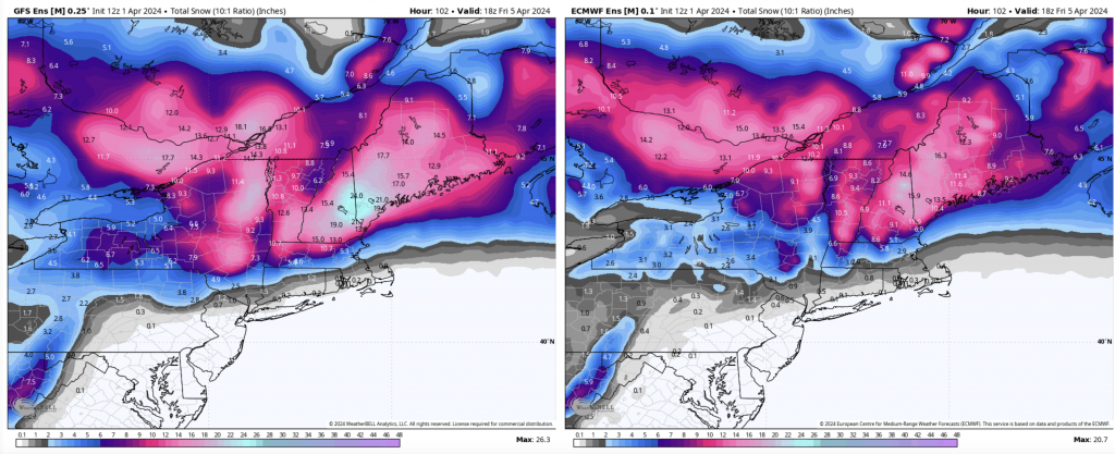 There’s a lot of components to this storm, the most important being low placement, and the affect of the negative NAO on the movement of the low. As you may be watching runs come in from the models, that’s the biggest difference-factor. The GFS has a full blown stalled low right into southern Maine, whereas the Euro stalls it off the coast of Midcoast Maine before it meanders inland. The Canadian has the strength of the GFS but the placement of the Euro. However, as the ensembles below show, the Canadian looks more like the GFS. Hopefully the oz data can shed a little more light on the upper level dynamics at play. I’ll be putting out first call snowfall totals in the morning update.