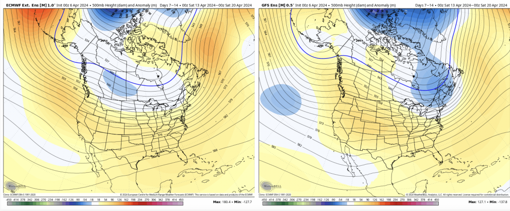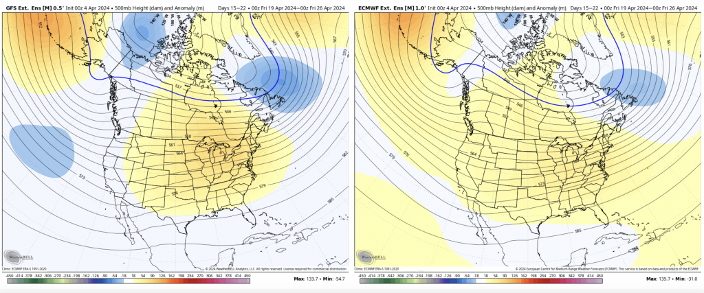 By Days 14-21, the ridge looks to shift slightly to the east but still centered over the Great Lakes. With the shifting ENSO cycle/global patterns, it’s not surprising to see the pattern stalling out. The GFS shows some very mild Omega block signs continuing. No major anomalies to note in this time frame.