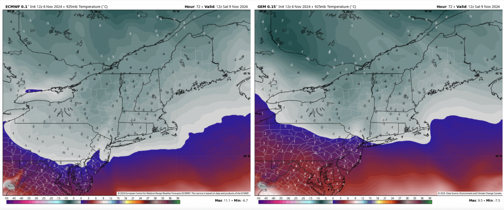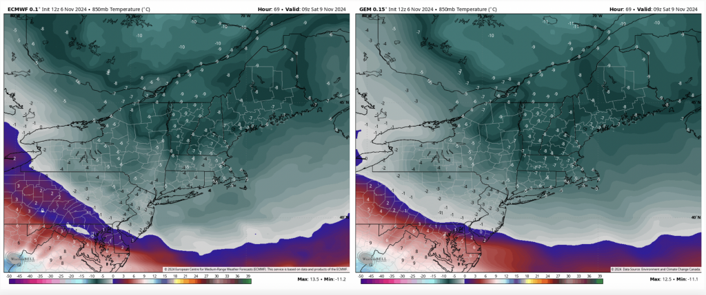 I’ve posted the Euro and the Canadian 850 mb temps for the deepest point of the cold for Saturday morning. The Euro has been consistent with this air mass and the Canadian sees cold depth better than most other models. They are quite similar in pattern and strength as well. The core of this cold will be in around 4am on Saturday, but quickly moving out.