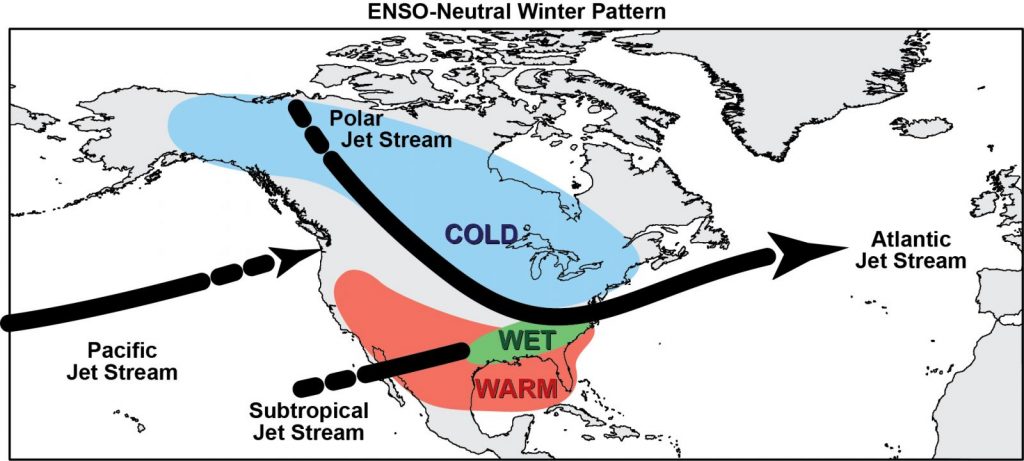 In terms of where we are in the ENSO cycle, we’re still solidly in the neutral phase. The August/September/October ONI was -0.2. It’s still expected that we get into the weak La NiƱa, but typical neutral patterns tend to be better for storm tracks in the east.