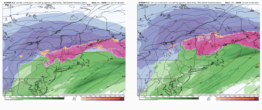 Beyond the debate of model accuracy and reliability, we nonetheless have a major system for the end of the weekend. We’ll still deal with the mixed precipitation component of the storm, however, it looks a lot less substantial for areas in central New York, Vermont, New Hampshire and Maine. Areas south of that will still be dealing with sleet, potentially substantial freezing rain, or even rain into the Catskills and Mid-Atlantic. As cold air wraps back in, everything will likely change back to snow briefly before the system moves out Monday morning. We are talking easy double digit numbers for areas that do not mix.
