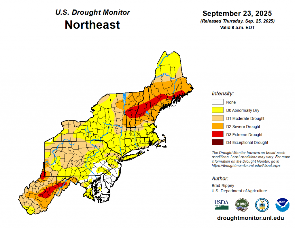 While portions of PA & NY remain less affected, the drought covers nearly the entire Northeast. The worst of the drought stems from interior VT to Downeast Maine. The key for next spring/summer will be getting enough water down before the ground freezes, though that will be a tall order. We are in a 10-16″ deficit in some areas, and have only 8-10 weeks before the ground freezes up.