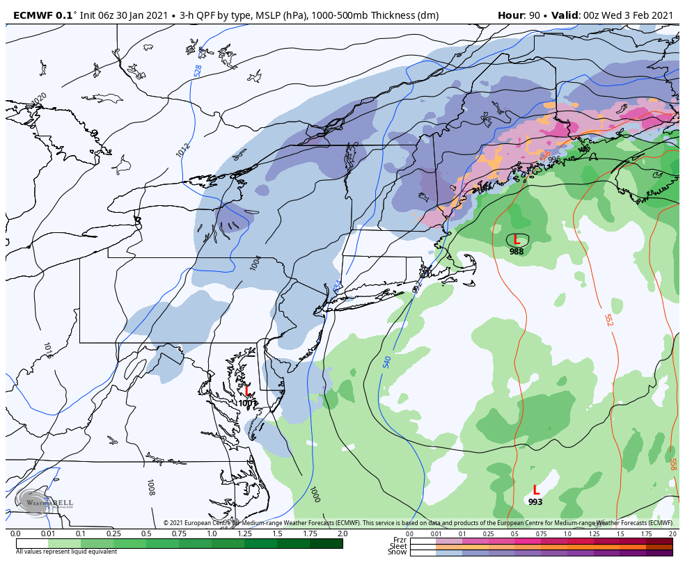 The warm air aloft is winning out with the incoming storm – the NAO has shifted positive, which was a concern in this flip – and therefore we’re not able to hold the cold through the entire column of air. We keep cold at the surface thanks to cold air damming, but that can only …