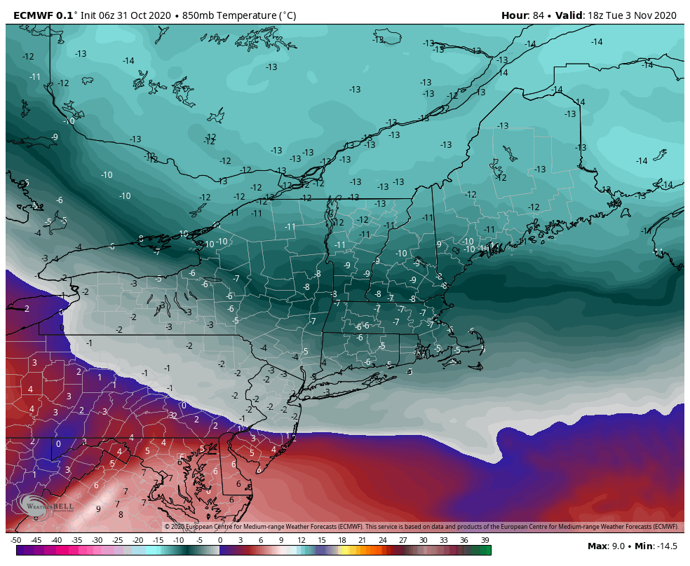 While the cold blasts are taking their time coming in, and not hanging around incredibly long, they are at least…coming in. The first enters the picture this weekend, and there is some lingering cold throughout the northern tips of ME/VT/NH throughout the week. However with rain expected during the week, it’s not the most guns-blazing …