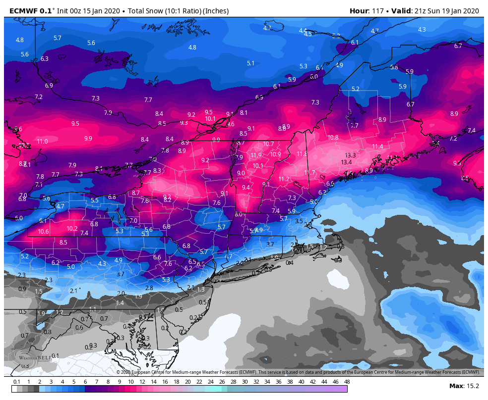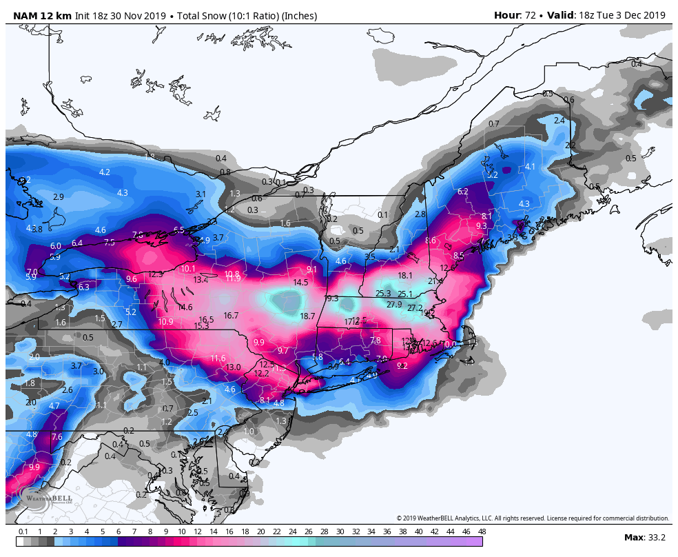 With the largest storm of the season heading towards us Sunday, here’s another update to supplement the video update from Friday. We’re still looking at a large swath of heavy snowfall from central NY to southern VT & NH – putting Mount Snow & Hunter in the prime positions to take home a gold medal …